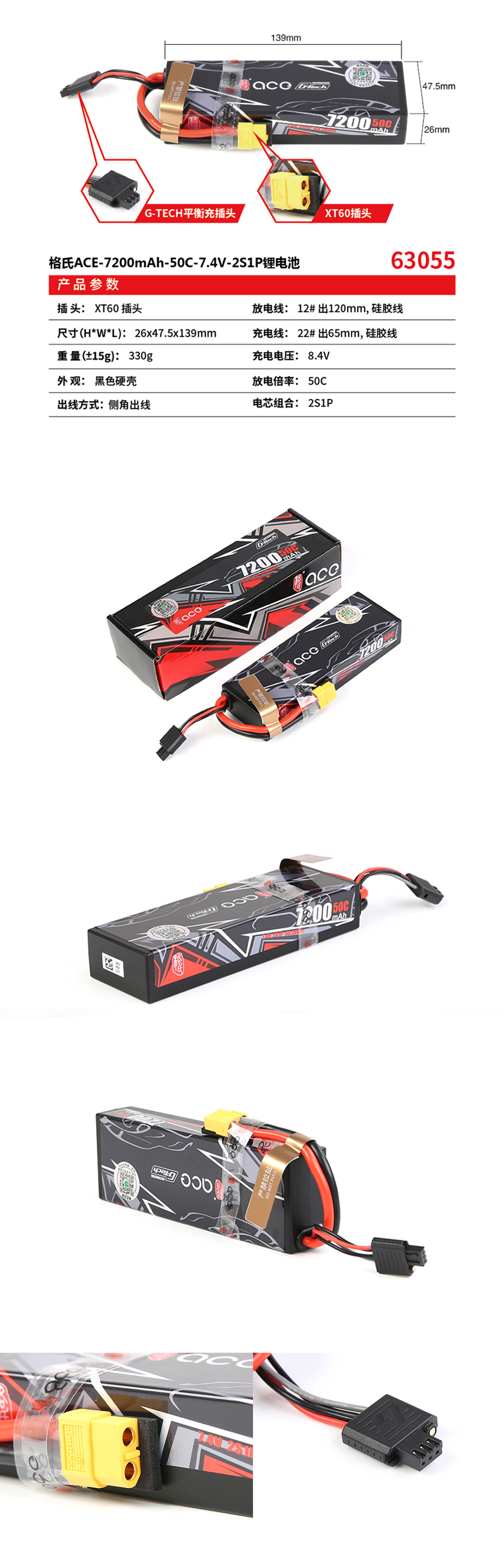 63055 格氏ACE-7200mAh-50C-7.4V-2S1P锂电池(G-TECH平衡充插头)(标配XT60插头)